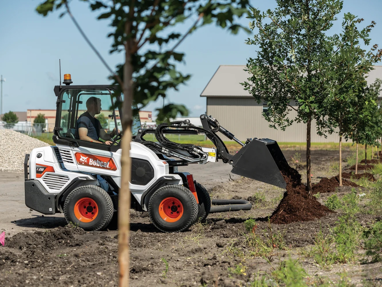 The Bobcat® L28 small articulated loader is a compact machine that easily works inside fenced-in landscapes, pens, backyards and more.